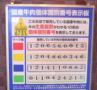 昨今のBSEや偽装事件により、お客様の安全に関する意識が高まっております。当店でもお客様のニーズに出来るだけお答えするため、店頭にて取り扱い牛の個体識別番号を表示させて頂いております。